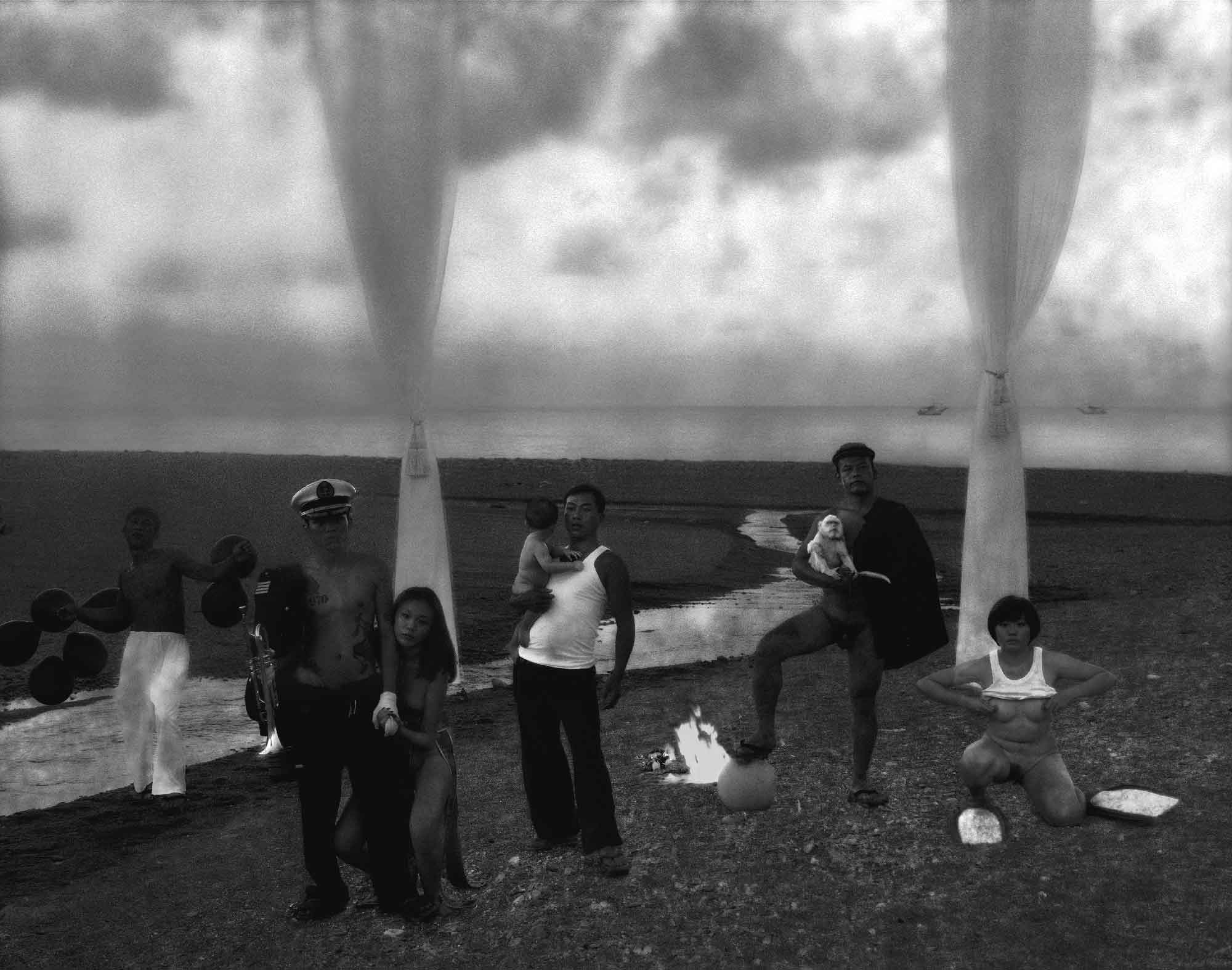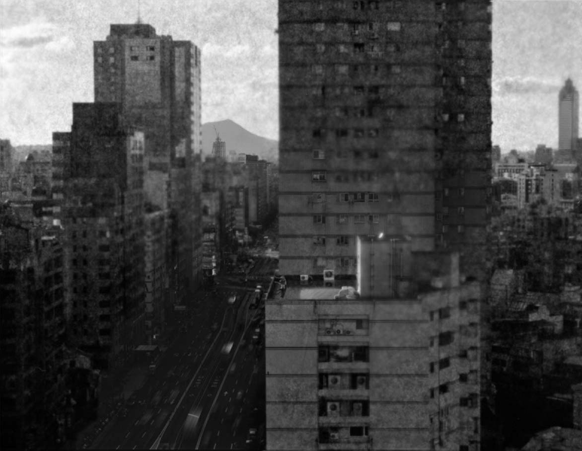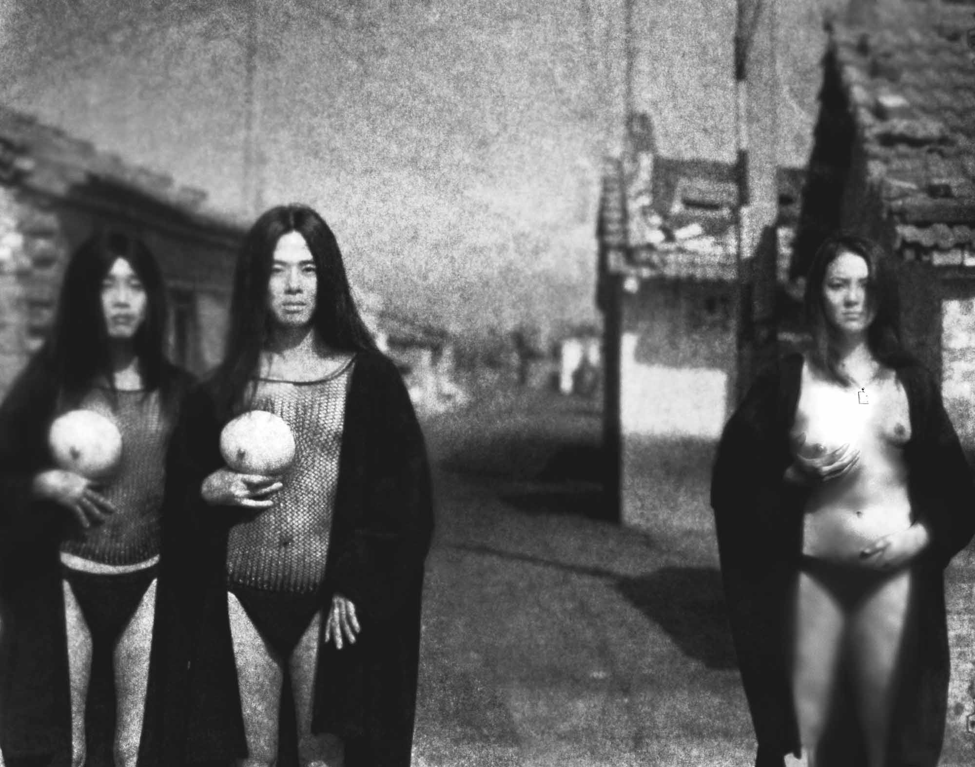 Surrounding the performance are dark black-and-white photographs taken over a fifteen-year span in a suburb of Taipei undergoing intense urbanization. These images braid together the elements of the narrative: food, sacrifice, blood, sex, and death. Some photomontages, drawing on the sadomasochistic fantasies of Japanese eroticism, are hard to bear.