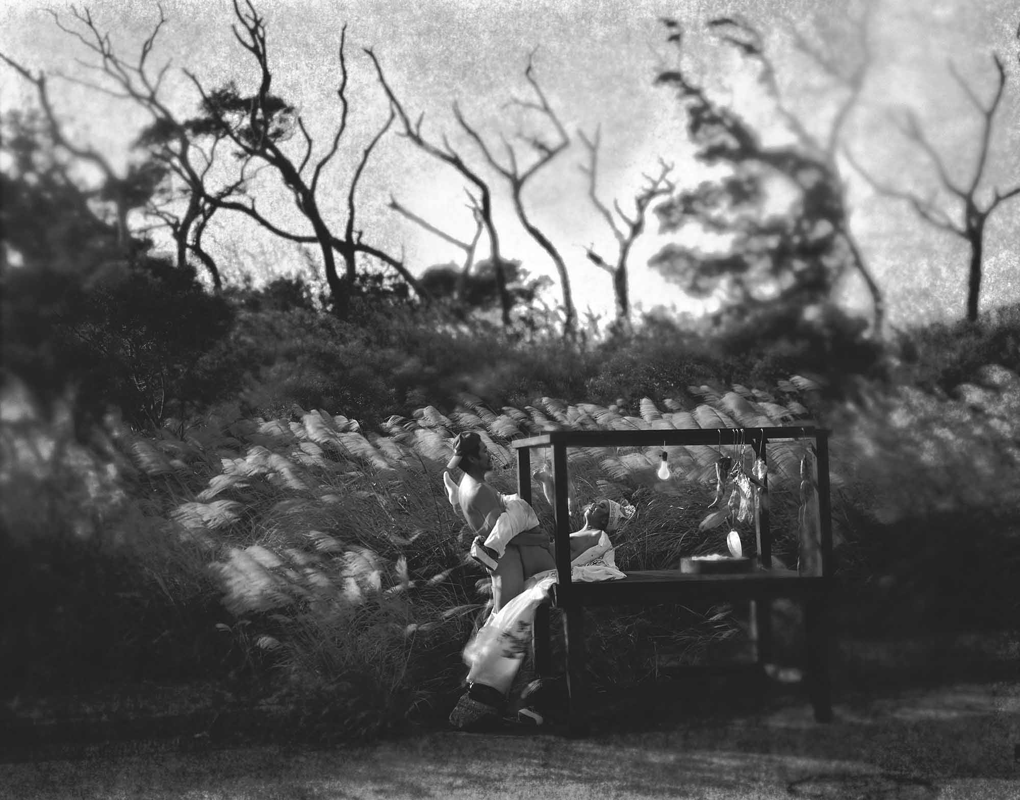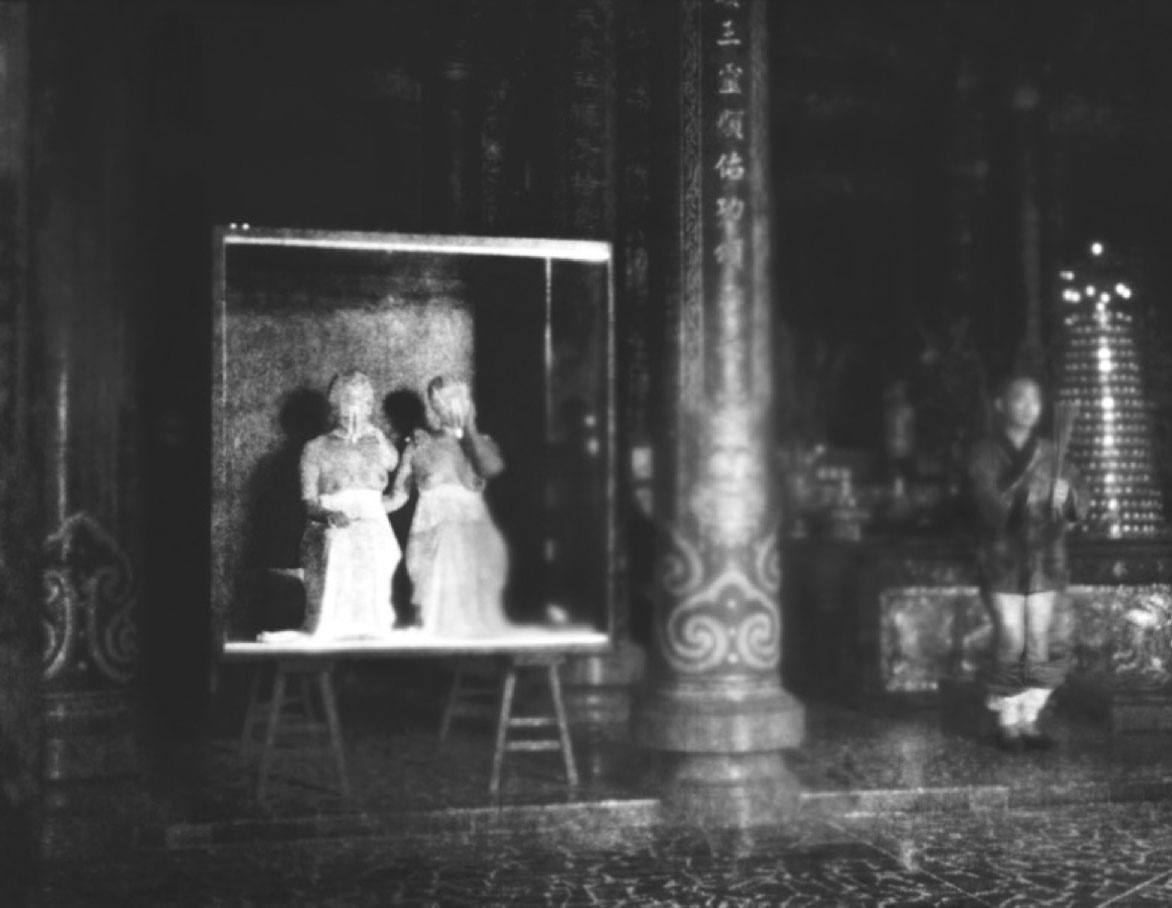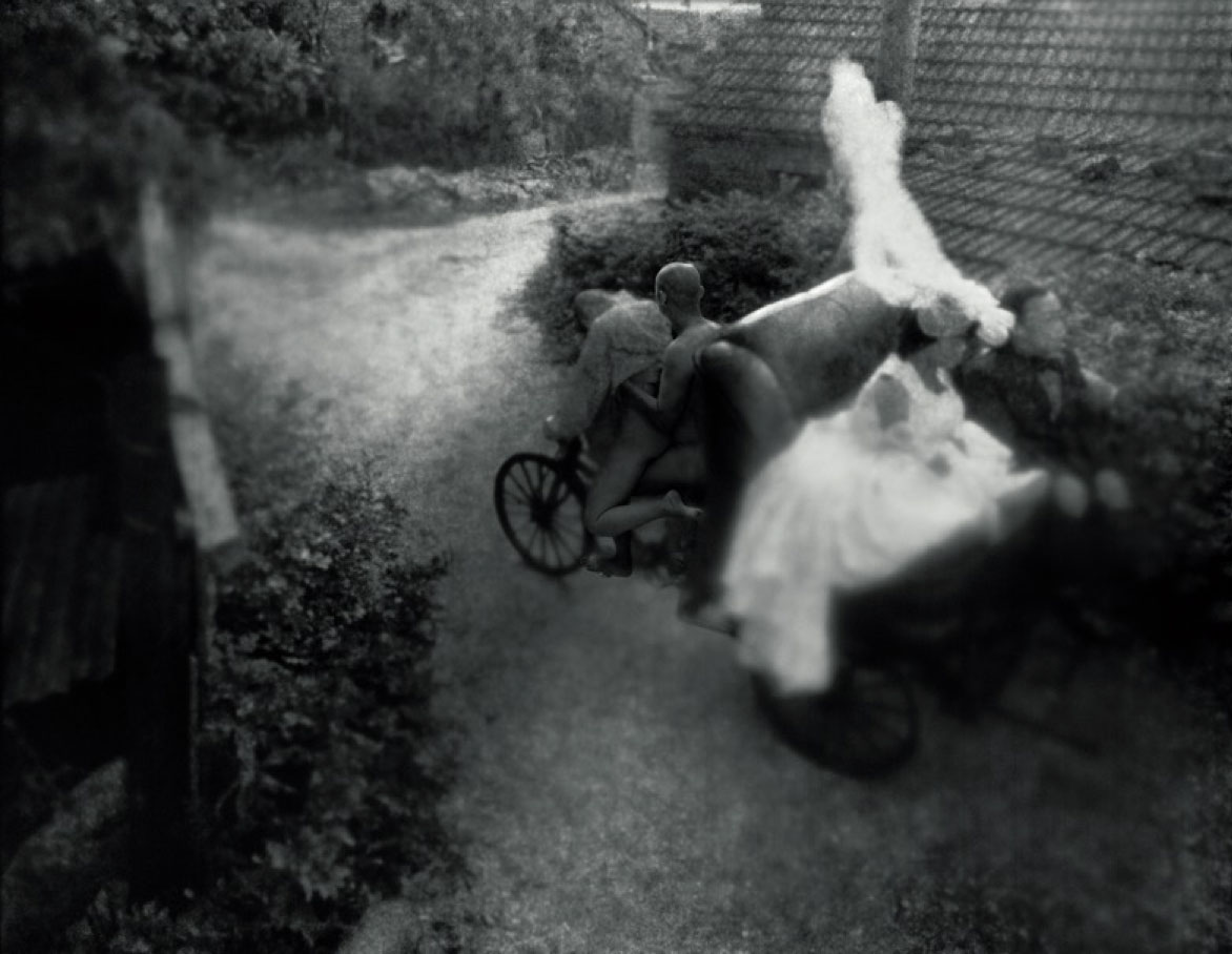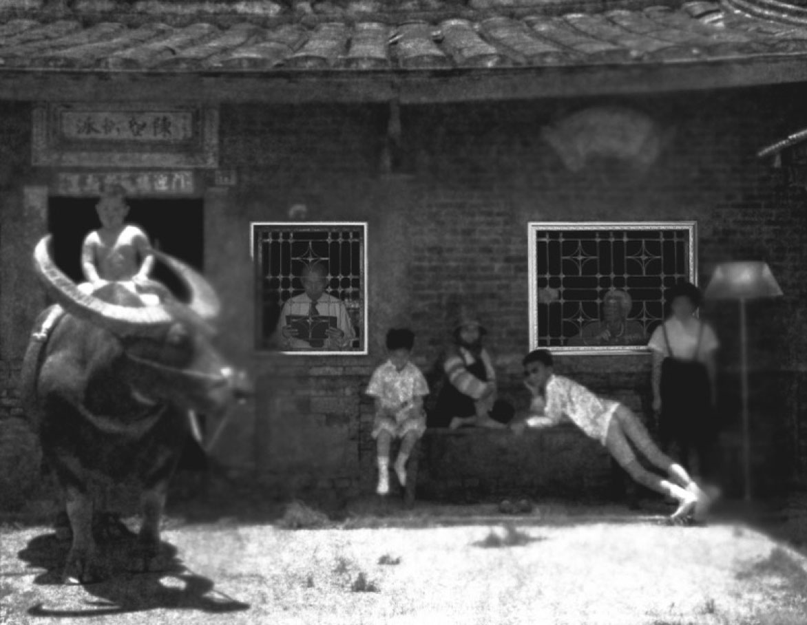 Surrounding the performance are dark black-and-white photographs taken over a fifteen-year span in a suburb of Taipei undergoing intense urbanization. These images braid together the elements of the narrative: food, sacrifice, blood, sex, and death. Some photomontages, drawing on the sadomasochistic fantasies of Japanese eroticism, are hard to bear.